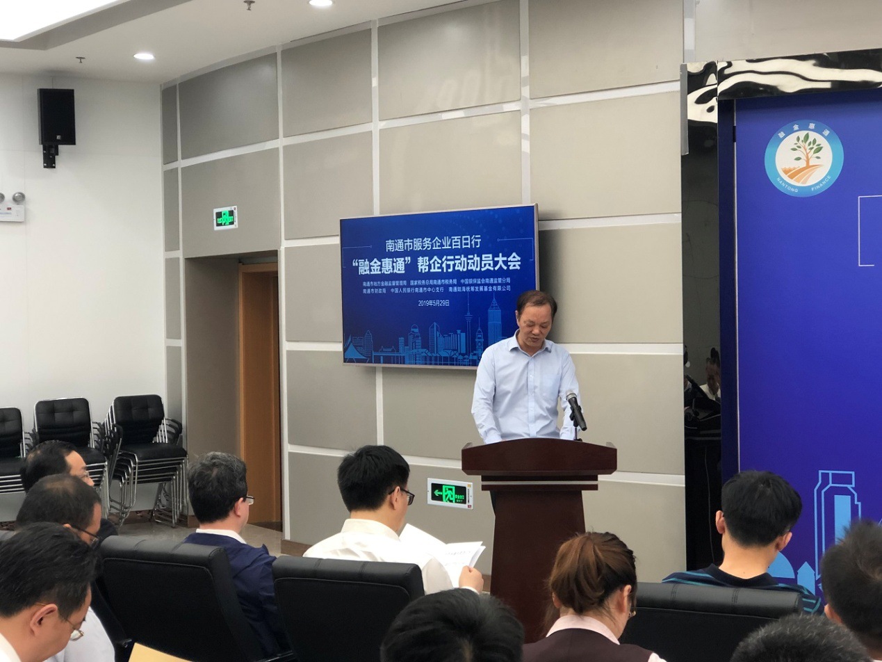 5月29日上午,南通市地方金融監(jiān)督管理局在市中小企業(yè)金融服務(wù)中心路演大廳召開“融金惠通”幫企行動(dòng)動(dòng)員大會。大會由南通市地方金融監(jiān)督管理局局長張乃華主持,南通市市委常委、常務(wù)副市長單曉鳴出席大會并致辭,南通產(chǎn)業(yè)控股集團(tuán)有限公司副董事長顧建國作為南通陸海統(tǒng)籌發(fā)展基金代表及“融金惠通”幫企行動(dòng)市直二分隊(duì)隊(duì)長進(jìn)行了表態(tài)發(fā)言。