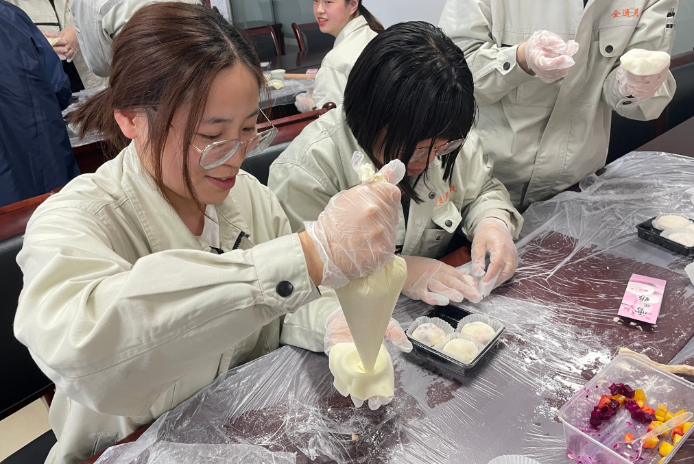 當天下午,金通靈近100名女職工歡聚813活動室,在張老師的現(xiàn)場制作教導下,分別制作了雪媚娘和便當?shù)案?。活動現(xiàn)場,張老師講解了烘焙知識和制作流程,職工們在認真聆聽后,體驗著自己動手制作甜品的樂趣,享受著快樂的烘焙時光。隨著時間的推移,一個又一個飽滿、垂涎欲滴的雪媚娘、一個個精致的便當?shù)案庵谱魍瓿伞?