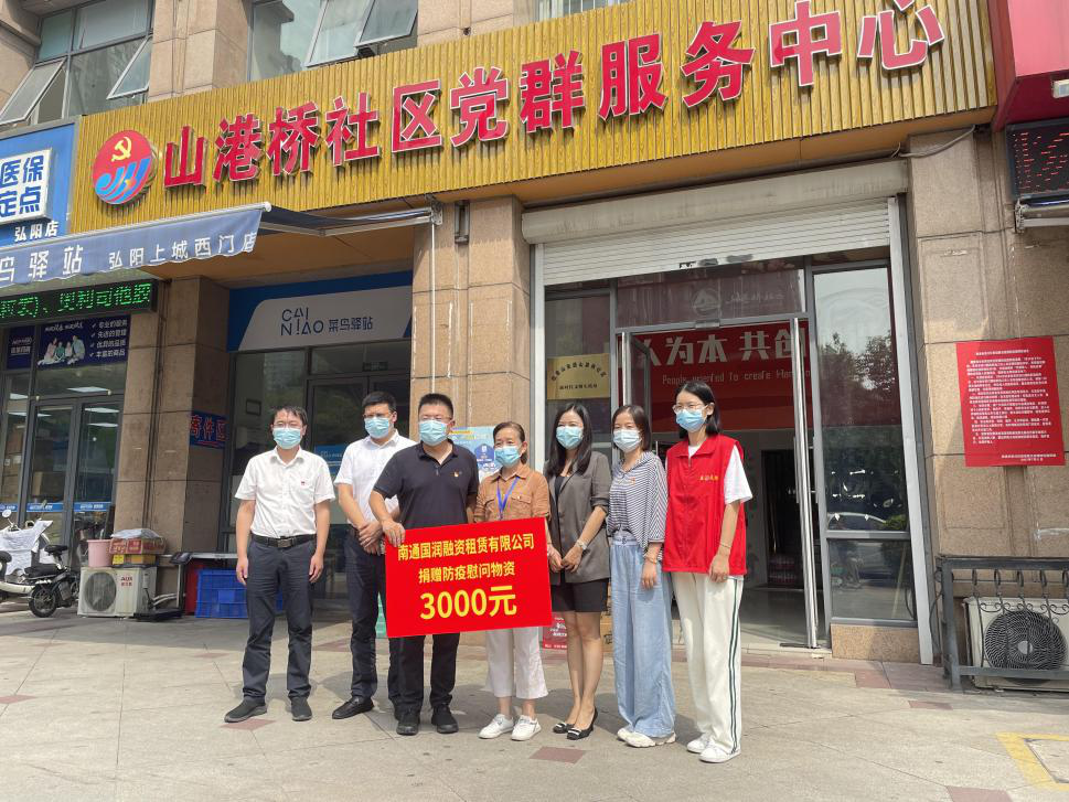 8月26日下午,南通國潤融資租賃有限公司支部書記、董事長陳大鵬同志,帶領公司主要領導班子及黨員干部走訪了觀音山街道山港橋社區(qū)防疫一線,同時捐贈價值3000元的愛心物資,并委派兩名同志下沉,積極參與社區(qū)疫情防控志愿服務工作。