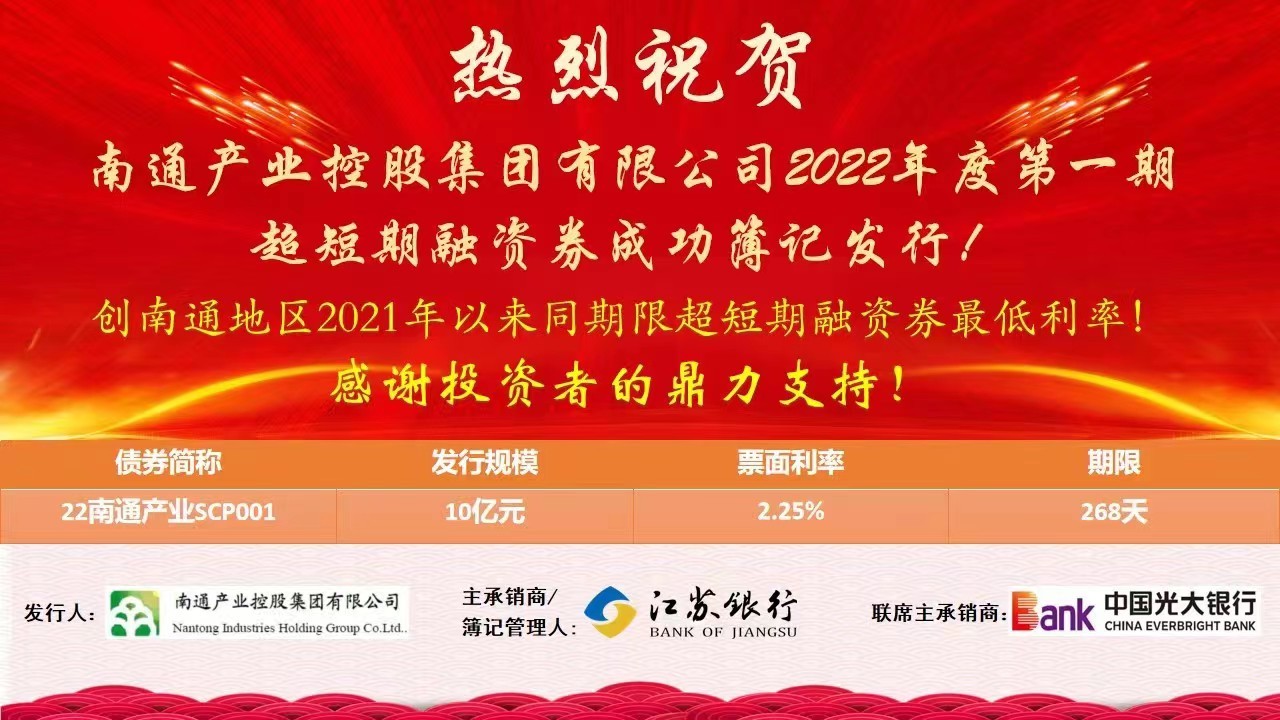 5月24日,產(chǎn)控集團成功發(fā)行10億元超短期融資券。由于產(chǎn)控集團的良好資質(zhì)得到投資者的高度認(rèn)可和踴躍認(rèn)購,發(fā)行利率僅為2.25%,創(chuàng)南通地區(qū)2021年以來同期限超短期融資券的最低利率!