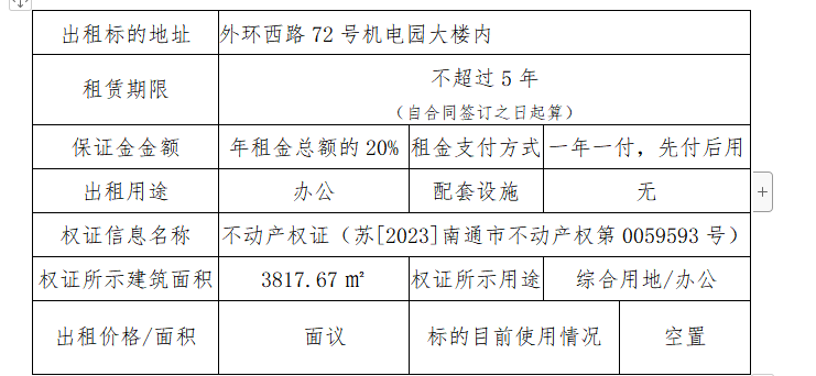 南通國(guó)泰創(chuàng)業(yè)投資有限公司所托管園區(qū)外環(huán)西路72號(hào)機(jī)電園,已由南通三玖企業(yè)管理服務(wù)有限公司中標(biāo)負(fù)責(zé)整體招商運(yùn)營(yíng)管理,擬打造成“產(chǎn)業(yè)研發(fā)、辦公及配套商業(yè)”的總體格局,即日起公開(kāi)對(duì)外招租。 一、出租標(biāo)的信息